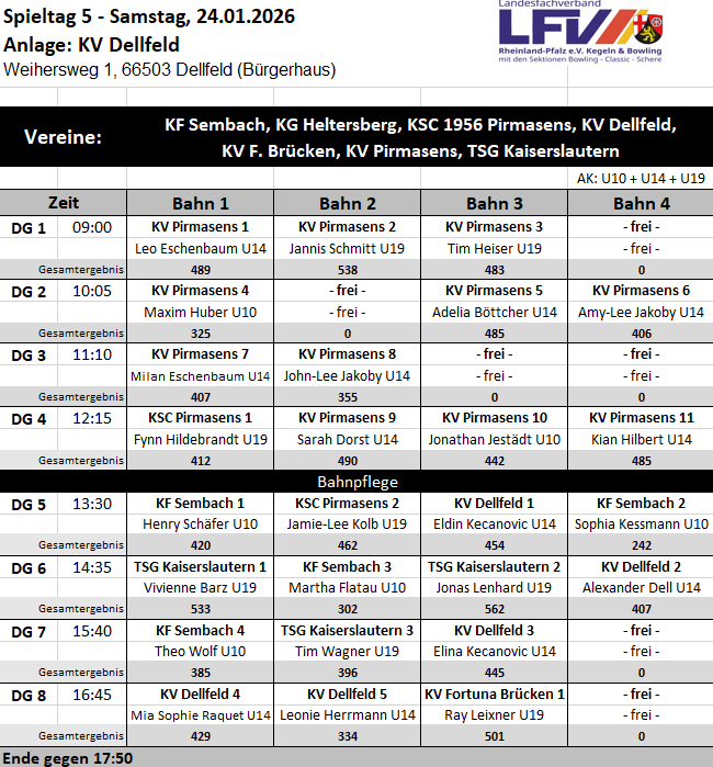Die Veranstaltung begann um 9:00 Uhr und endete gegen 17:50 Uhr. Insgesamt präsentierte sich der KV Dellfeld als hervorragender Gastgeber und trug maßgeblich zu einem gelungenen Spieltag der Landesjugendrunde in Rheinland-Pfalz bei.