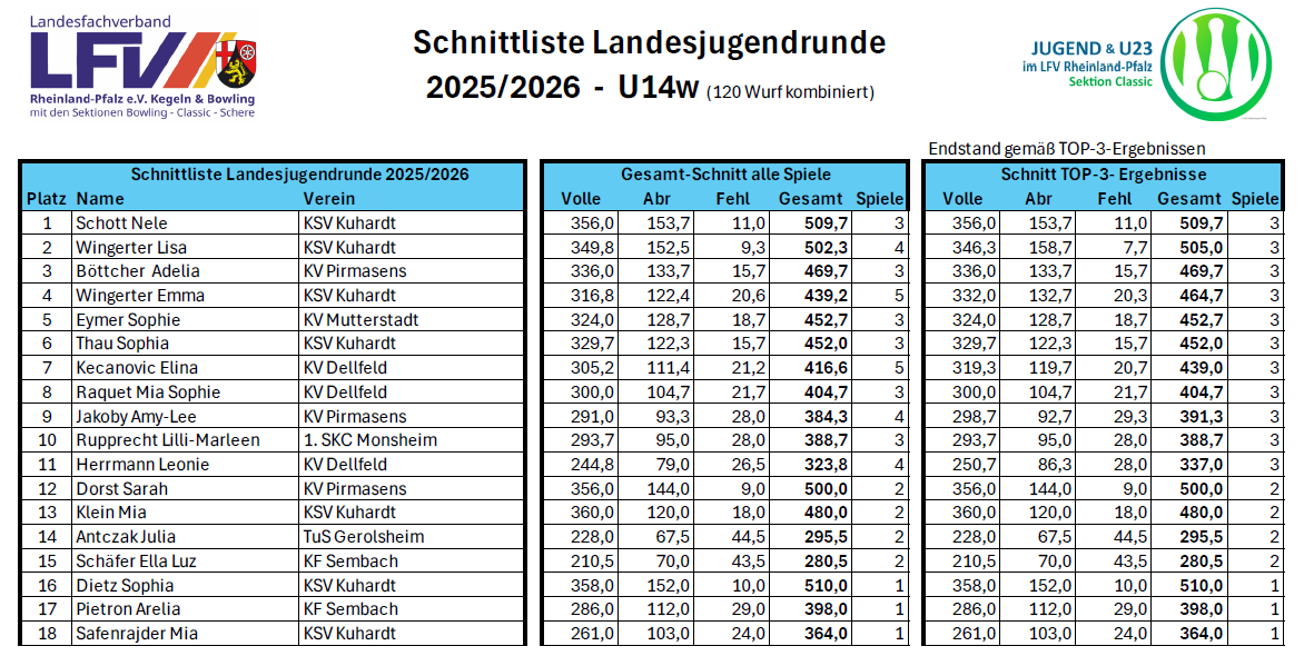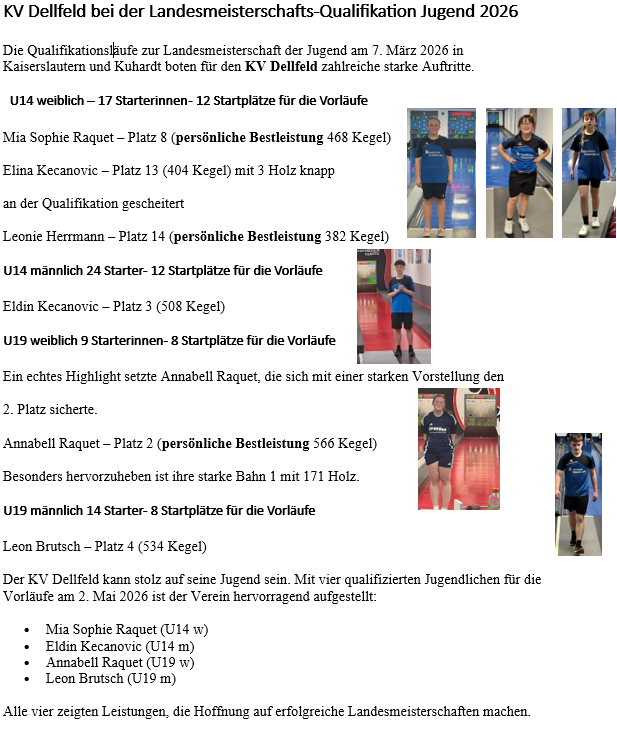 Am vierten Spieltag der Landesjugendrunde am 7. Dezember 2025 traten vier Jugendliche des KV Dellfeld in Pfeddersheim an. Die Bahnen waren anspruchsvoll, und gute Ergebnisse mussten sich hart erarbeitet werden. Unsere Spielerinnen und Spieler zeigten dennoch starke Leistungen: