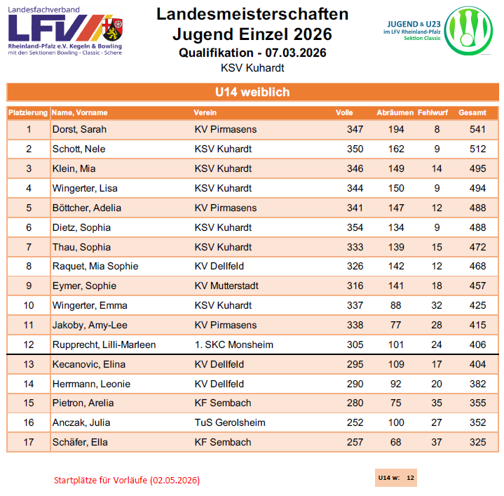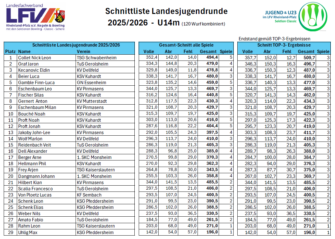 Die Jugendlichen des KV Dellfeld haben in der Landesjugendrunde 2025/2026 starke Leistungen gezeigt und sich in mehreren Altersklassen hervorragend präsentiert. Besonders erfreulich: Eldin Kecanovic erreichte in der U14m einen hervorragenden 3. Platz und damit die beste Platzierung aller Dellfelder Starterinnen und Starter. Die Ergebnisse der übrigen Jugendlichen zeigen ebenfalls eine positive Entwicklung und viel Potenzial für die kommenden Jahre.